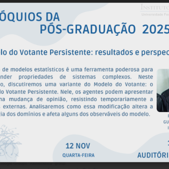 Prezada comunidade, Convidamos a todos para participarem do Colóquio da Pós-Graduação, que será apresentado pelo doutorando Rafael Guimarães (IF-UFF), orientado pelo Prof. Dr. Wellington G. Dantas (IF-UFF). A apresentação acontecerá na quarta-feira, 12 de novembro, às 17h, no Auditório da AGIR (Torre Nova). Título: Modelo do Votante Persistente: resultados e perspectivas Data: 12/11/2025 Horário: 17h Local: Auditório AGIR (Torre Nova) Resumo: O estudo de modelos