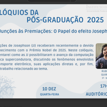 Prezada comunidade, Convidamos a todos para participarem do Colóquio da Pós-Graduação, que será apresentado pelo doutorando Rubens Quirino (IF-UFRJ), orientado pelo Prof. Dr. Caio Lewenkopf. A apresentação acontecerá na quarta-feira, 10 de dezembro, às 17h, no Auditório da AGIR (Torre Nova). Título: Das Junções às Premiações: O Papel do efeito Josephson Data: 10/12/2025 Horário: 17h Local: Auditório AGIR Resumo: As junções de Josephson (JJ) receberam recentemente o devido